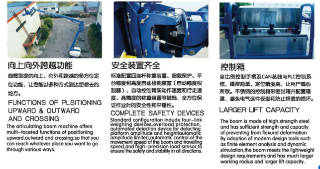 自行曲臂式高空作業平臺動力分為柴油發動機型、直流馬達型,升降臂有二節、三節、升降高度從10米至32米、所有機型全高度行走、曲臂延伸升降、轉盤360旋轉。不同機型配備不同的動力源,以適應室內室外的不同要求。使用柴油機或者蓄電池動力驅動,配合有效的幾何設計和超長的跨越半徑,使該款機型可以有效地避開棘手的障礙物作業。緊湊的工業設計底盤,優異的原地零尾擺旋轉能力,因此低于20米的自行曲臂式升降作業平臺能在有限的空間靈活操作。自行曲臂式升降作業平臺是您維修、安裝、修剪等高空作業的理想工具。